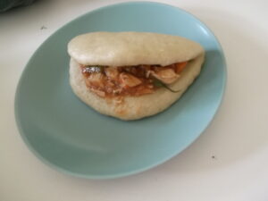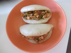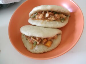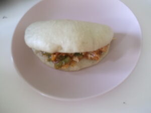 中身は鶏肉、ニンジンチャン、インゲン豆みたいな細い豆にトマトソースBBQ味のような酢豚みたいな味付けだけど酢豚ほど酸っぱくない感じのソースですw