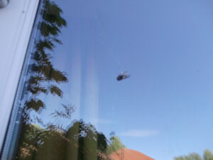 窓にクモの巣があって、そこにハチかブヨかハエの巨大化みたいなのが引っかかっていました。